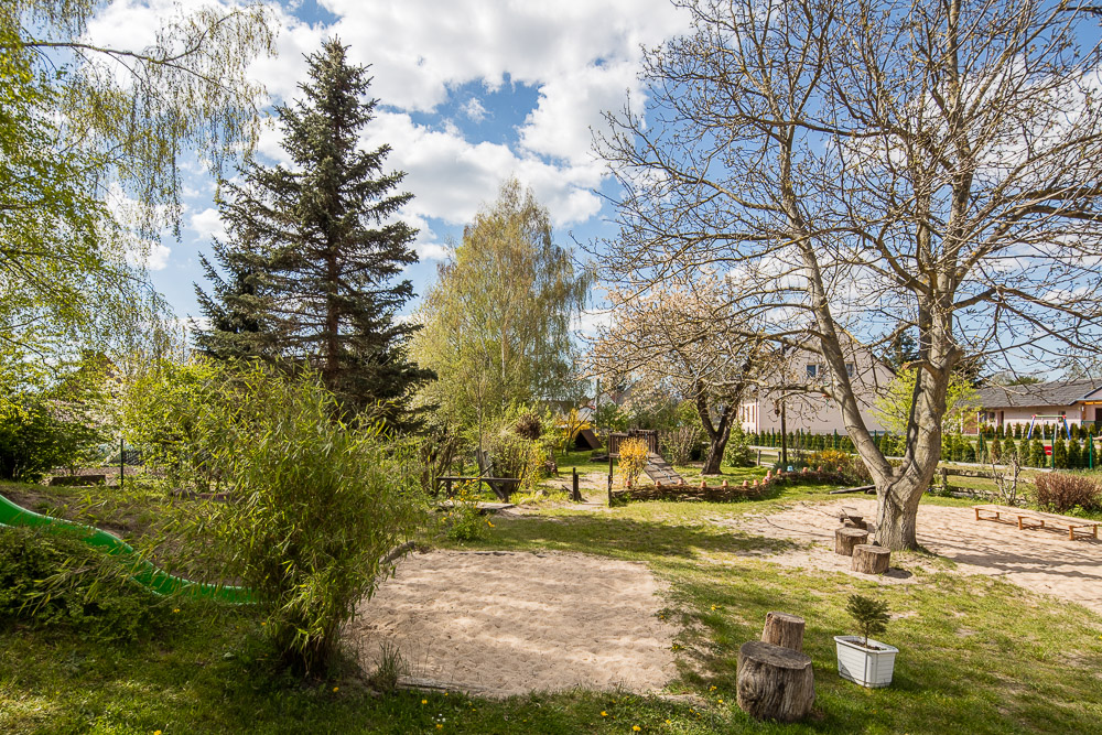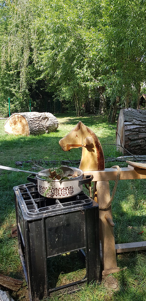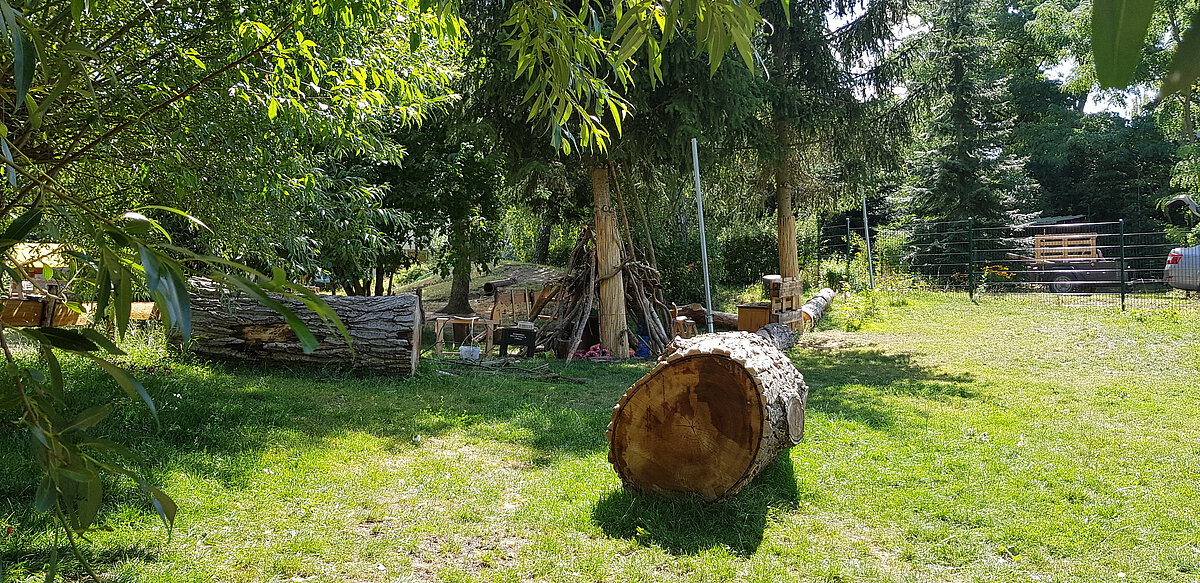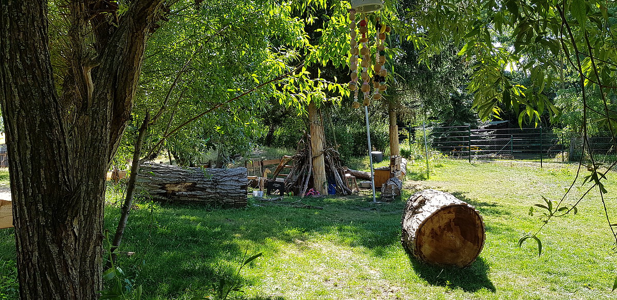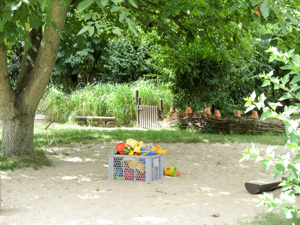 Das Außengelände ist so gestaltet, dass es die Kinder zum Lernen, Entdecken und Forschen einlädt. Unser Naturspielplatz ist nicht nur eine grüne Oase für die Tiere, sondern auch für alle Kinder. Gebüsche, Bauwerke aus Weiden und andere Gewächse laden zum Spielen, Verkriechen und Sammeln von Naturerfahrungen ein.