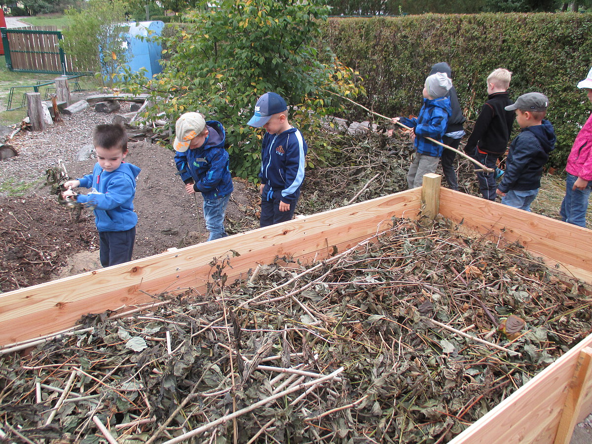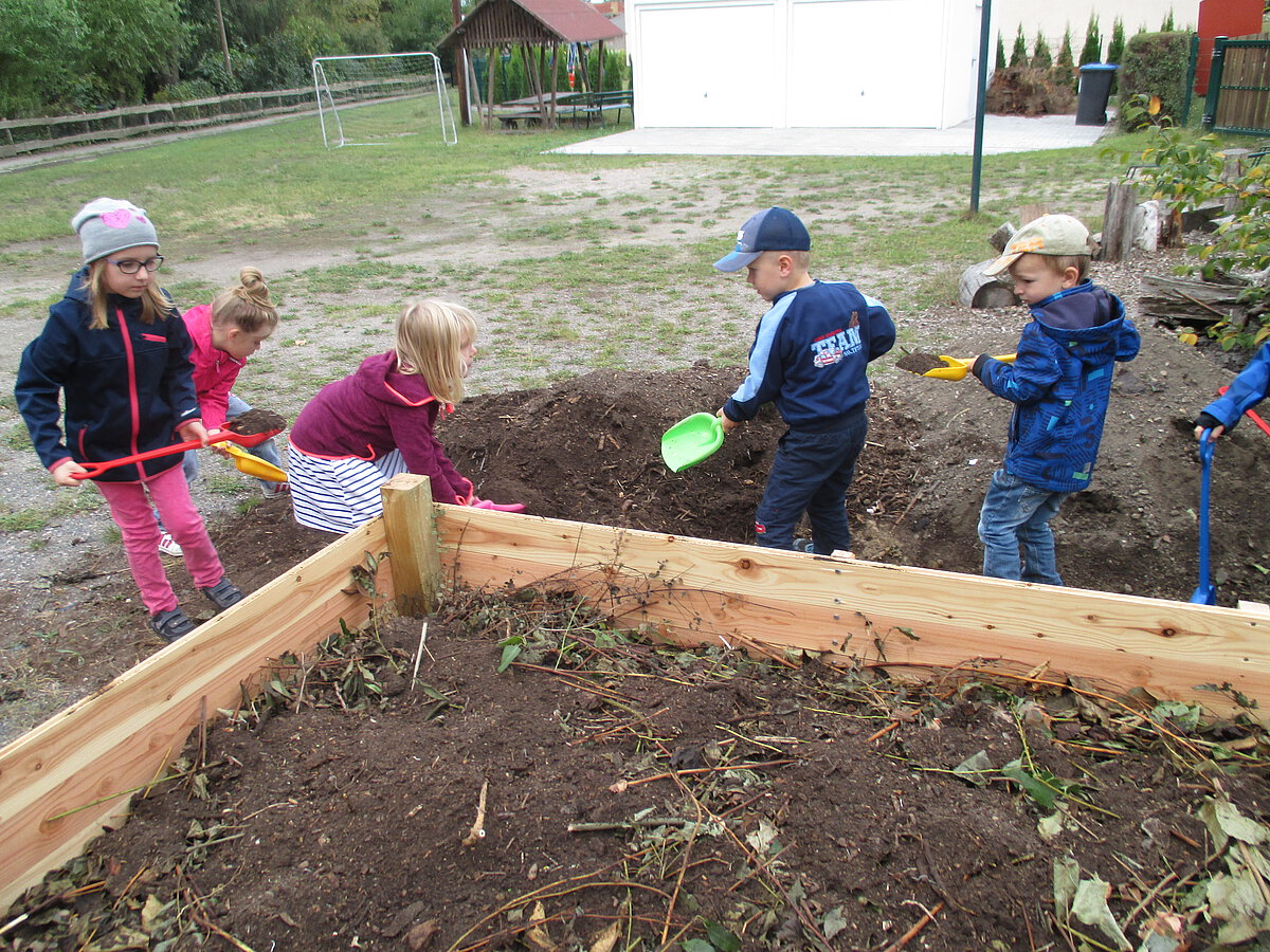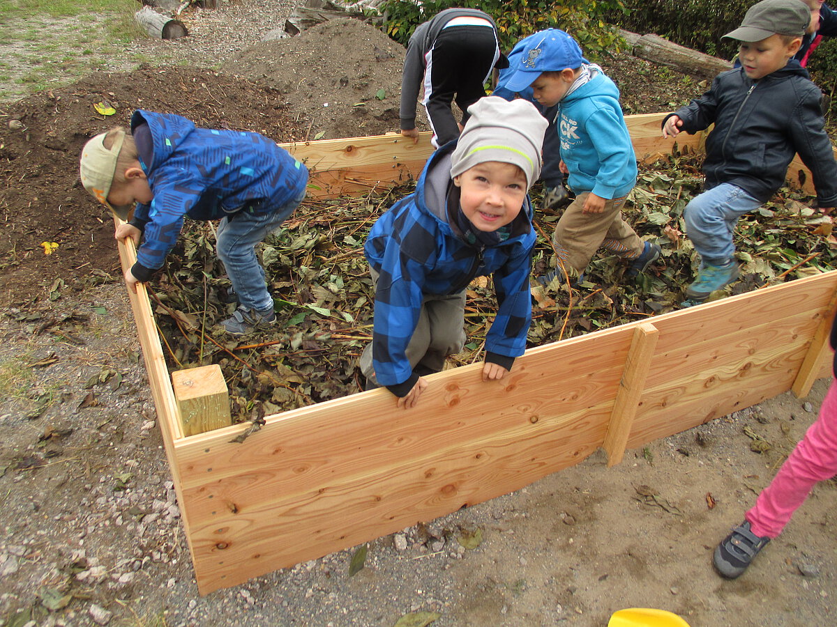 Im Spätsommer 2016 entstand im Rahmen eines Team-Workshops auf unserem Außengelände ein Hochbeet. Unser Hochbeet ist für die Kinder eine hervorragende Möglichkeit, die Kreisläufe der Natur kennenzulernen, zu beobachten und zu verstehen. Die Aussaat und Bepflanzung, die Pflege und das Ernten erledigen wir gemeinsam mit den Kindern. Die Wissensvermittlung, die Übernahme von Verantwortung und das gemeinsame Handeln, fördern die Kinder ganzheitlich. Die geernteten Gaben werden alle in der Kindertageseinrichtung verarbeitet. Sie bereichern das Angebot von Frühstück und Vesper.